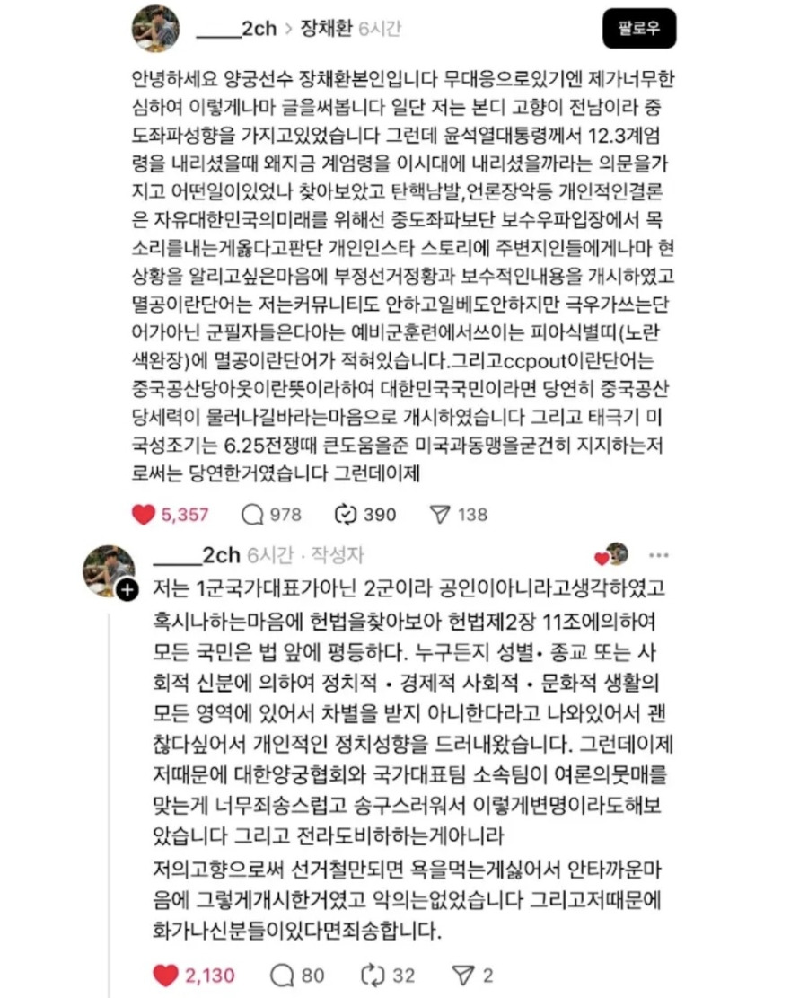 장채환 양궁 국가대표, ‘극우·부정선거 주장’ SNS 게시물 논란