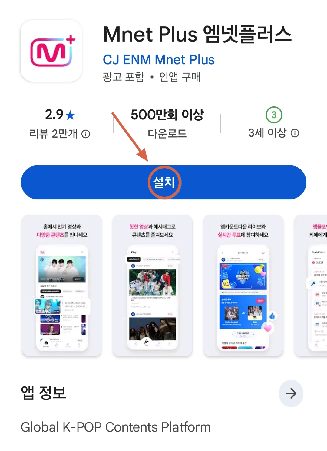 구글 플레이스토어(Android), 앱스토어(iOS)에서 Mnet Plus 앱 설치